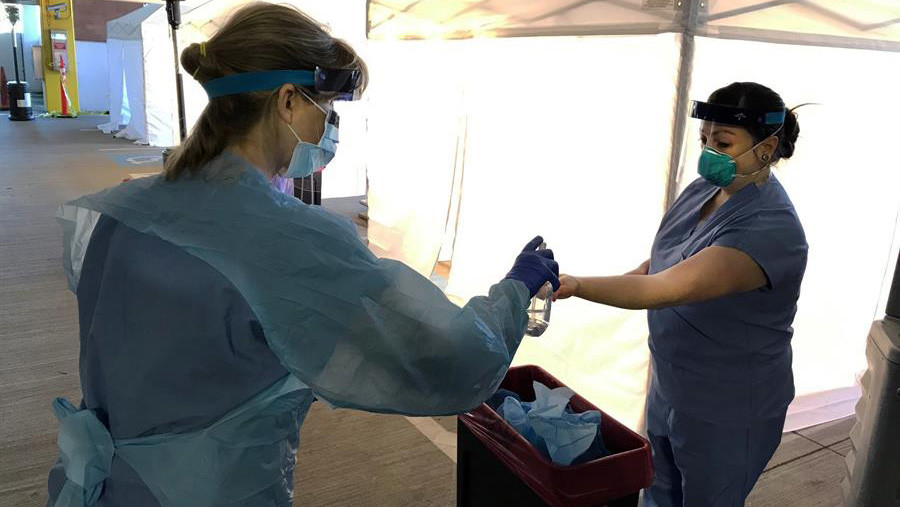 En un garaje del centro universitario de Seattle, ciudad del condado de King, el centro médico dispuso de varias carpas donde se pueden hacer las pruebas de su personal.