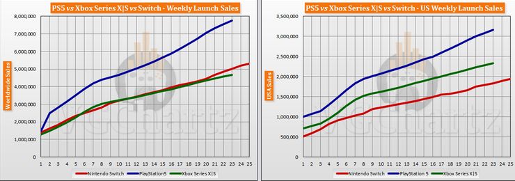 Según el último informe de VGChartz, el período de lanzamiento extendido ha sido significativamente más favorable para la consola PlayStation 5 de Sony en comparación con los competidores. Desde el estreno en noviembre de 2020, PS5 ha acumulado 7.763.924 unidades vendidas, lo que es mucho mejor que los logros de Xbox Series X / S y Nintendo Switch durante las mismas 23 semanas. Switch ha alcanzado las 5,008,963 unidades vendidas, mientras que el dúo de dispositivos Xbox modernos ocupó el tercer lugar con 4,668,388 unidades. Vale la pena mencionar que el Switch es técnicamente un dispositivo de última generación, pero está incluido en la generación actual simplemente porque Nintendo aún no ha presentado un sucesor. En ese sentido, considerando las ventas totales de por vida, el Switch obviamente está superando a la PS5 y la Xbox Series X / S combinadas, como se lanzó hace cuatro años.
