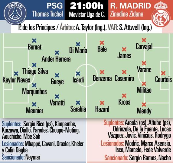 París es el escenario del debut en Champions de dos de los equipos que están en las quinielas para ganar el título. Son el PSG y el Real Madrid que debutan en esta competición con más dudas que otra cosa por su juego y resultados. Aunque si eso ya marcará el partido, lo que sin duda ha hecho que este debut sea descafeinado son las numerosas e importantes bajas que tienen ambos conjuntos para el estreno de esta noche. Así, el Real Madrid cuenta con siete ausencias entre lesionados y sancionados que afectan a la defensa y al centro del campo. Por su parte, el PSG no puede contar con su tridente ofensivo formado por Neymar, Mbappé y Cavani. El primeros está sancionado y los otros dos, lesionados. Sin duda, eso mermará el ataque del equipo galo que también tiene problemas en el lateral derecho.