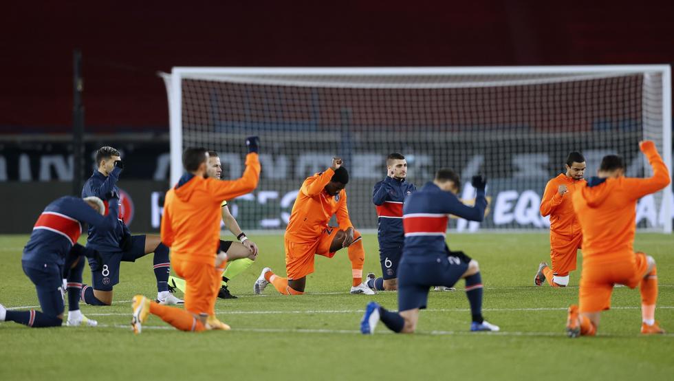 El escándalo racista del martes provocó la suspensión del PSG-Basaksehir, partido de la última jornada de la fase de grupos de la Champions, y una inmediata ola de indignación y repulsa del mundo del fútbol. Este miércoles, en los prolegómenos de la reanudación del encuentro, los jugadores de ambos equipos formaron de forma intercalada en el círculo central junto al nuevo equipo arbitral dirigido por el colegiado principal, el neerlandés Danny Makkelie, que sustituyó al cuarteto rumano que desató el incidente. Todos permanecieron unos instantes rodilla en tierra y con el puño el alto en una imagen ya icónica en la lucha contra el racismo. Un mensaje potentísimo que se envió al mundo.