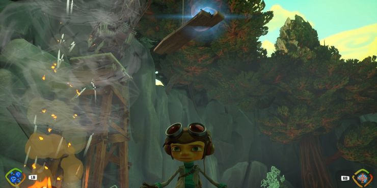 - Cuchillo de psitanio: Los jugadores deben dirigirse hacia el jet de Psychonauts y usar la corriente ascendente para llegar a una plataforma más alta. Al final de esta plataforma, los jugadores pueden ver una pequeña rama que marca el comienzo de un camino que se puede balancear y saltar, lo que lleva a una cueva distante donde se esconde el cuchillo. Una vez en la cueva, Raz puede escalar los altos pilares de piedra para detectar el objeto.
