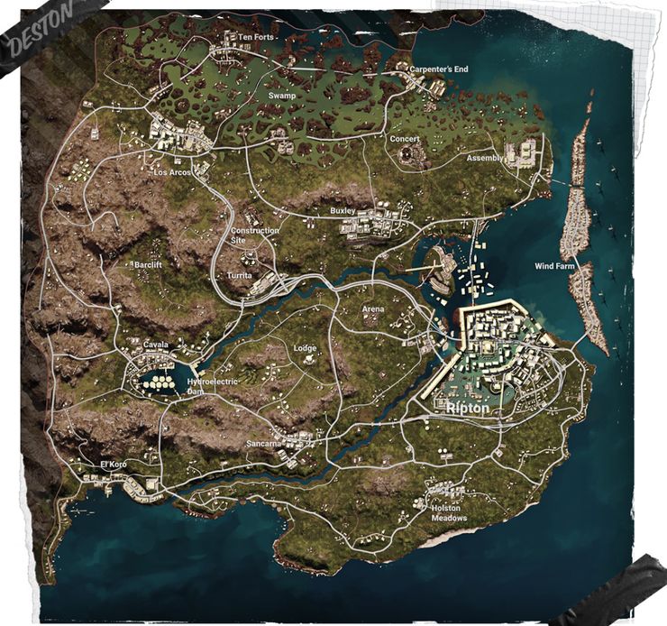Deston es el mapa más grande jamás agregado a PUBG, proporcionando una multitud de ciudades y puntos de referencia para que los jugadores exploren. Ofrece un entorno único y diverso que va desde pantanos y costas hasta ciudades y laderas de montañas. Los edificios altos de la región brindan una gran cantidad de excelentes lugares para francotiradores, y los nuevos paracaídas reutilizables permitirán a los jugadores reposicionarse en otros edificios sobre la marcha. También alberga muchos lugares secretos, a algunos de los cuales solo se puede acceder mediante drones.