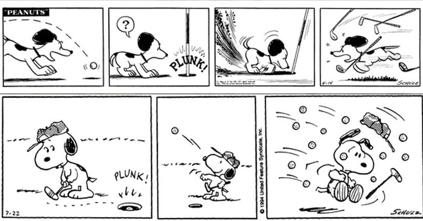 En un cómic publicado en abril de 1954, se muestra a Snoopy persiguiendo una pelota de golf que cae en el hoyo. Termina cavando en el hoyo para recuperar la pelota, lo que lleva a golfistas enojados a lanzarle sus palos para sacarlo del green. Es una tira divertida que encaja con quién era Snoopy en ese momento. Sin embargo, 40 años después, en una tira de julio de 1994, Se demuestra que Snoopy es un golfista. mientras mete la pelota en el hoyo. Cuando la devuelve, otros golfistas le lanzan sus pelotas enojados porque la pelota que regresa puede causar confusión.