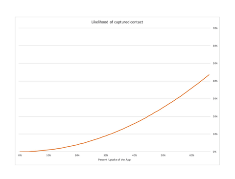 Para que la aplicación sea útil, la tasa de adopción tiene que ser extremadamente fuerte. Como es de esperar, hay una correlación positiva entre el número de personas que usan una aplicación de seguimiento de contactos y la eficacia general de la aplicación. A medida que más personas lo usan, más vale la pena. Pero Mostashari señala que incluso si 1/3 de la población se descarga y utiliza una aplicación de seguimiento de contactos, todavía sólo cubrirá alrededor del nueve por ciento de las interacciones cercanas.
