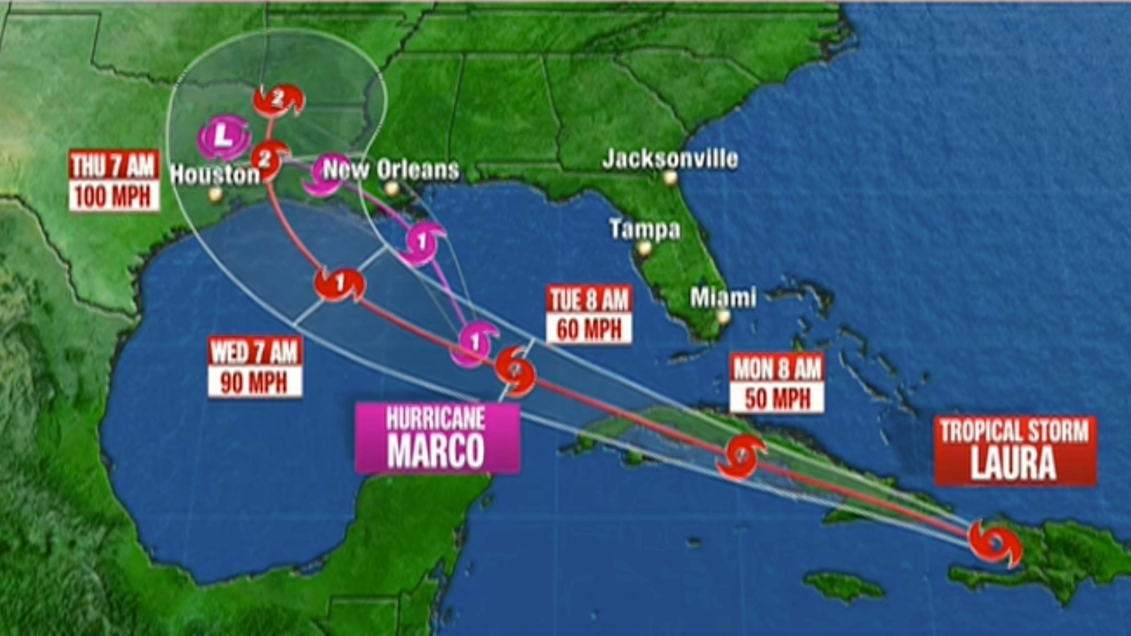 Como las posibles trayectorias de la tormenta tropical Laura y el huracán Marco las muestran estando simultáneamente en el Golfo de México en los próximos días, es posible que te estés preguntando: ¿se pueden unir y convertirse en un huracán más potente?