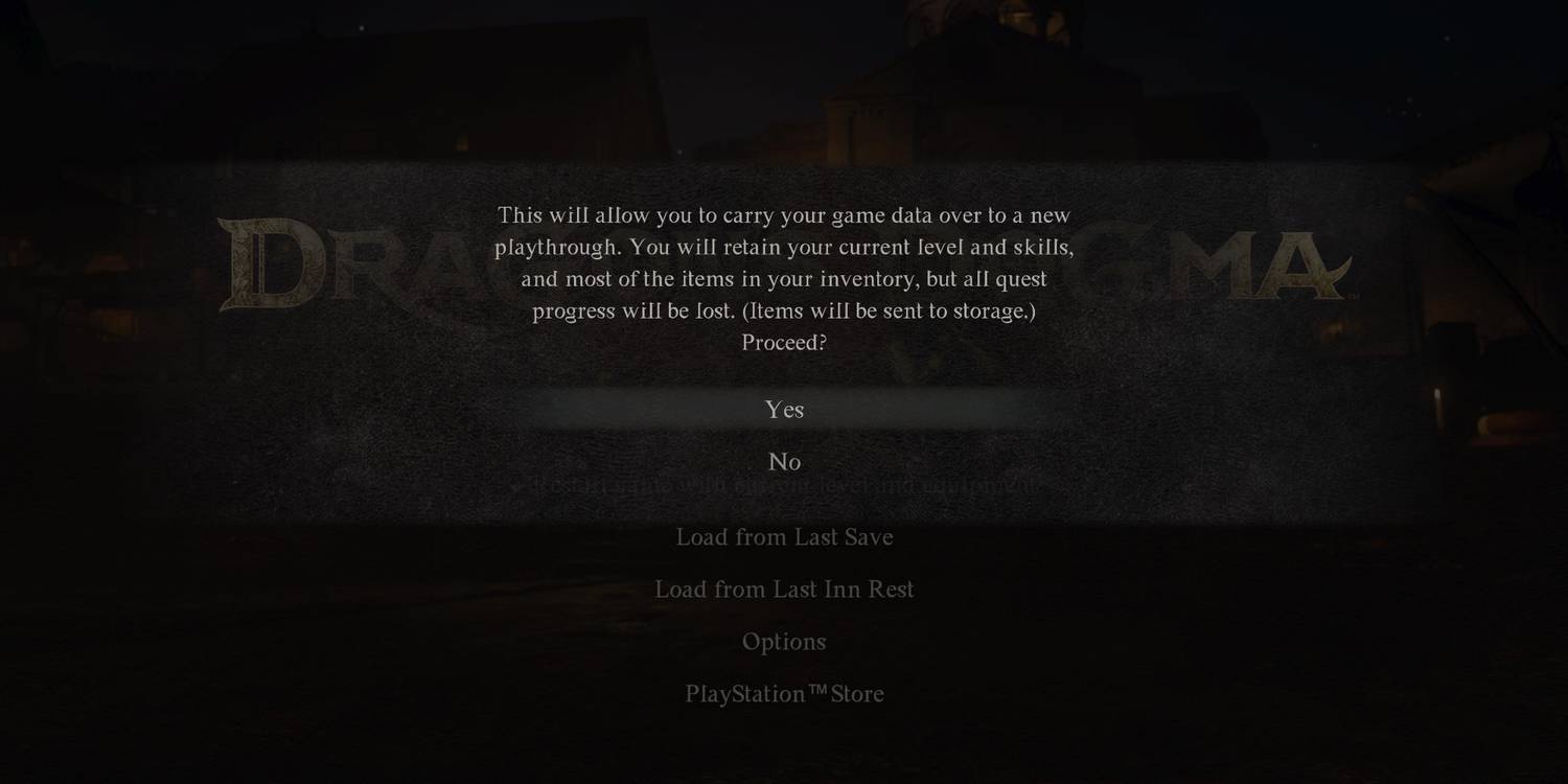 Una vez que se acumulan los créditos y el juego lleva a los jugadores de regreso al menú principal, aparece una tercera opción para continuar jugando: “Reinicia el juego con el nivel y el equipo actuales.“. Esto es esencialmente New Game Plus para Dogma del Dragón 2, donde el juego se reinicia pero mantiene el personaje actual. Para la apertura del juego, los artículos y equipos se enviarán a un almacén, que luego podrá recuperarse en una posada. Esto les dará a los jugadores la oportunidad de encontrar contenido que se perdieron en su juego inicial, o tal vez ver resultados diferentes de las misiones que ya completaron una vez. Hacer esto inmediatamente después del final estándar impide que los jugadores vean el final real.ya que habrá que volver a jugar el partido completo.