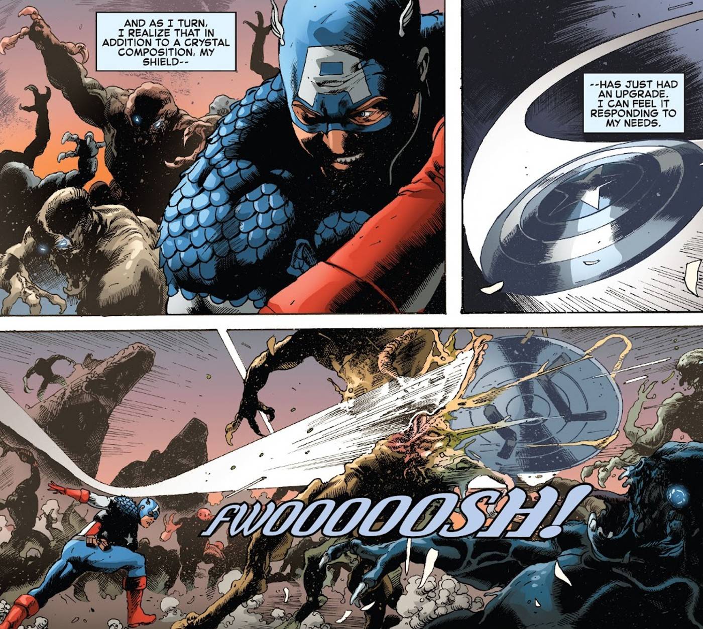 - El escudo del Capitán América se ha transformado con poderes mejorados, lo que le permite controlar telequinéticamente su vuelo, resistir la magia y exponer verdades ocultas.