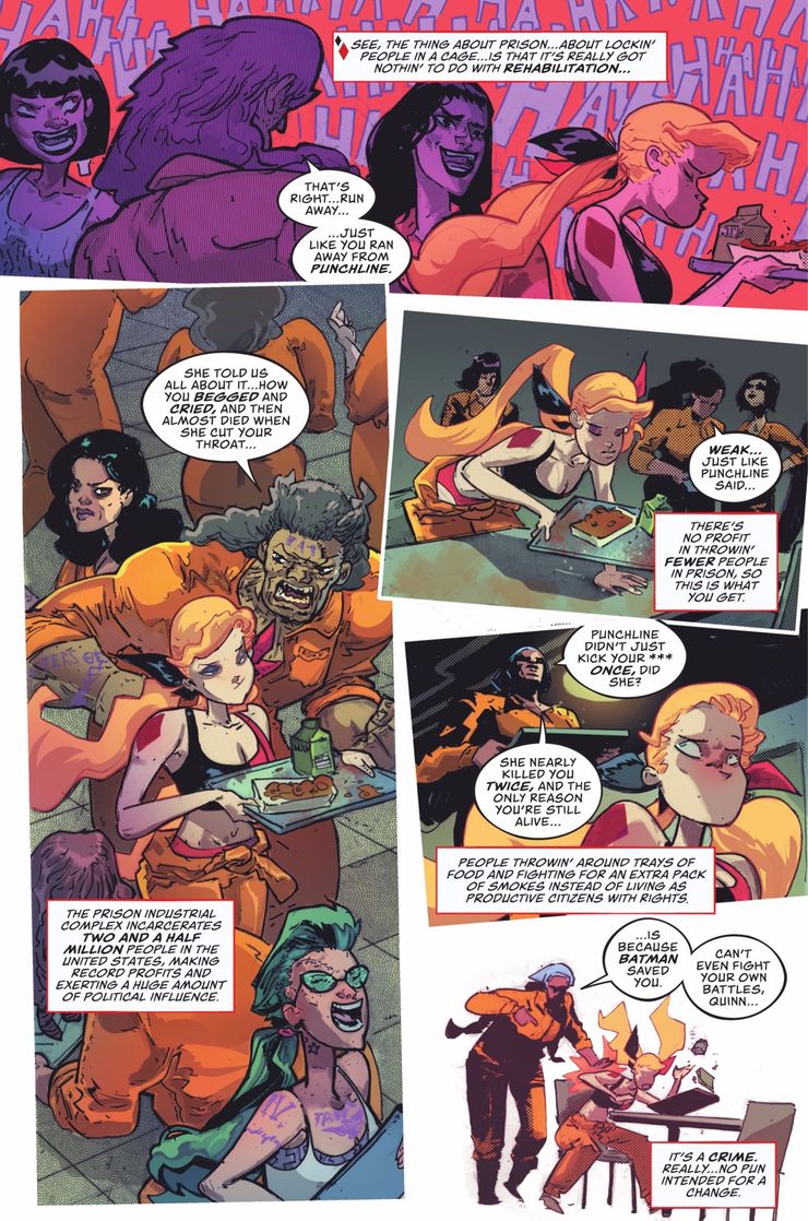 En harley quinn # 14 por Stephanie Phillips y Riley Rossmo, Harley todavía está recibiendo esa derrota devastadora frotada en su cara. En el problema, Harley está en prisión por un crimen que dice que no cometió, y mientras hace fila para recibir comida, algunos de los otros reclusos se enojan con ella, diciendo que Punchline les dijo que Harley rogó por su vida antes que ella. le cortaron la garganta, y que la única razón por la que todavía está viva es porque Batman la salvó. Si bien Harley Quinn respondió con un nivel apropiado de violencia, al menos para Harley, las cosas que decían eran, en su mayor parte, ciertas, con solo ligeros adornos para hacerla parecer débil.