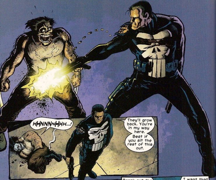 Mientras Wolverine se retorcía en el suelo de dolor después de que Punisher lo derribara humillantemente, los mafiosos que lo perseguían lo rodearon, dejando a Punisher disponible para emboscar a los villanos distraídos y derribarlos a todos. Si bien es humillante, la táctica de Punisher para incapacitar a Wolverine es ingeniosa dado el esqueleto protector de Wolverine. Wolverine previamente tenía todo su esqueleto recubierto con adamantium, lo que le otorga una armadura interna que evita lesiones graves en los ataques. Según la anatomía humana, no hay huesos en la región de la entrepierna del cuerpo, que también es una de sus áreas más sensibles. Debido al factor de curación de Wolverine, Punisher sabía que dispararle en la entrepierna sería la forma más efectiva de derribarlo sin temor a matarlo.