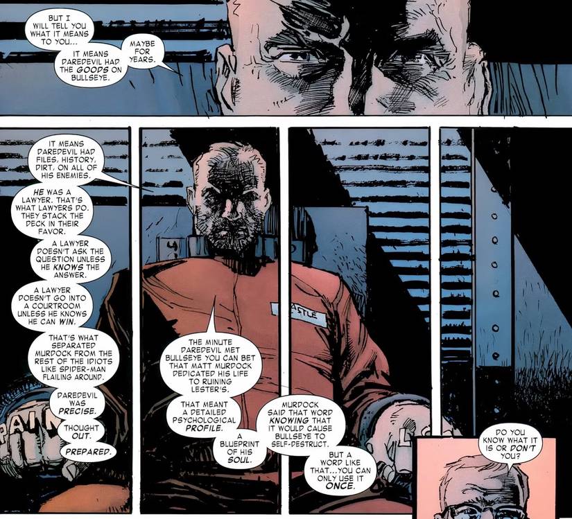 Punisher plantea la idea de que Matt sabía exactamente lo que tenía que decir para volver loco a Bullseye. Daredevil había estudiado a Bullseye y tenía todo lo que necesitaba para arruinarle la vida.y Punisher presenta un argumento extremadamente convincente sobre cómo esto podría ser posible.