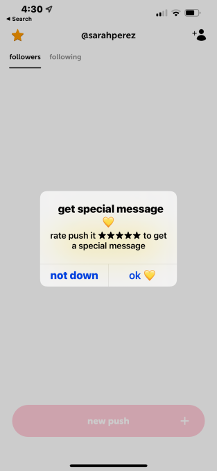 En medio del impulso actual para una mayor privacidad, las mecánicas de crecimiento basadas en SMS generalmente son despreciadas después de años de invitaciones de aplicaciones demasiado entusiastas que se convirtieron en la norma. Afortunadamente, sin embargo, Push it no envía mensajes de texto automáticos a tus amigos. (Sin embargo, la política de privacidad de la aplicación no hace mucho para calmar los temores sobre lo que está haciendo con sus datos personales. Está claro que los datos se utilizarán con fines de marketing y se compartirán con los proveedores y socios comerciales de Push, dice la política).