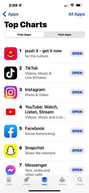 La aplicación Push it iOS se publicó en la App Store a fines de octubre, anteriormente con el nombre de “Proyecto Rojo”, según los datos de Sensor Tower. Eso solo estarán disponibles para mercados selectos a partir de anoche, incluidos Australia y California. Verlo ya en el n. ° 1 lo convierte en un lanzamiento sospechoso, uno que generalmente indica haber confiado en gran medida en el marketing previo al lanzamiento o en los trucos de crecimiento, como es común ahora. (Ver también: primavera-topper Poparrazzi, cuyo crecimiento se abrió camino hasta el número 1).