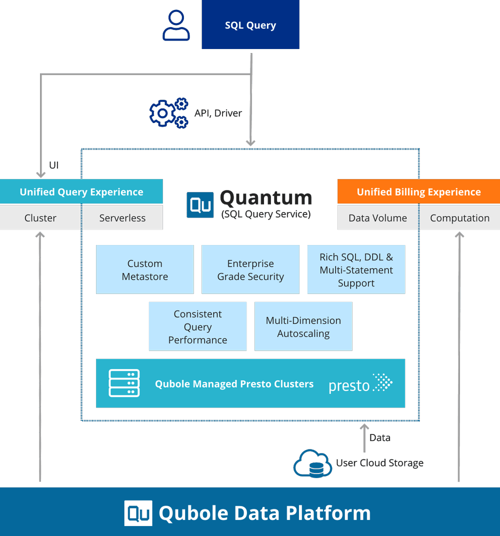 Qubole ya extrae la mayor parte de esto y ofrece lo que es esencialmente una plataforma sin servidor. Sin embargo, con Quantum, va un paso más allá al lanzar un motor SQP sin servidor de alto rendimiento que permite a los usuarios consultar petabytes de datos con ANSI-SQL, sin tener que elegir entre usar Presto. Clúster o un motor SQL sin servidor para ejecutar sus consultas, por ejemplo.