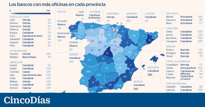 El poder de las entidades regionales. Analizando el mapa bancario por provincias destaca la abrumadora presencia de las entidades ligadas a un territorio. Así, Abanca lidera el número de oficinas en las cuatro provincias gallegas, mientras que Kutxabank lo hace en Euskadi. Igualmente, Ibercaja es el banco con más oficinas en las tres provincias aragonesas y Banca Pueyo lidera la clasificación en Badajoz.