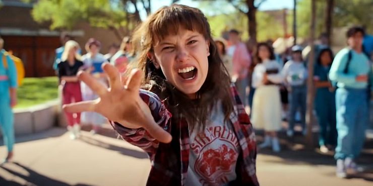 Millie Bobby Brown tiene 18 años y los poderes perdidos de Eleven en Cosas extrañas la temporada 4 la somete a una prueba retrospectiva que en realidad le permite a Brown parecer mucho más joven. Once tiene canónicamente 14 años en la temporada 3, la misma edad que Mike. En la temporada 4, Brown tiene 18 contra los 15 de Eleven más o menos, una brecha ligeramente menor que los 19 de Wolfhard contra los 15 de Mike.