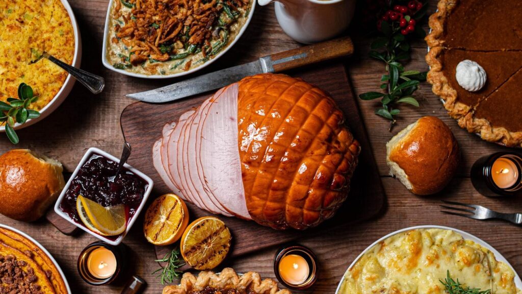 El pavo siempre es el plato principal en la mesa. Según la receta original, se sirve relleno y acompañado de salsa de arándanos rojos y puré de patata. Como postre, se sirve pastel de manzana.