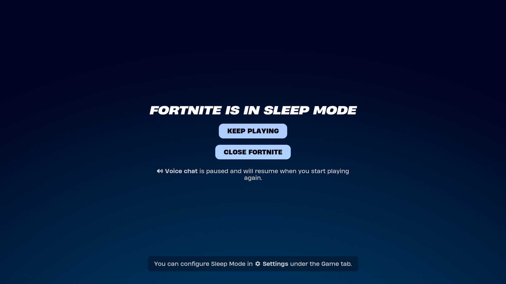 Según Epic Games, el modo de suspensión se activa automáticamente una vez que no detecta ninguna entrada del controlador, teclado o mouse durante 15 minutos. Con el modo de suspensión activado, el chat de voz, la nueva función de control parental de límites de tiempo y los informes de tiempo están en pausa. Los jugadores cuyo juego esté en modo de suspensión también aparecerán como Ausentes en su lista de amigos. Los demás miembros de un grupo con alguien en modo de suspensión pueden seguir jugando sin él.
