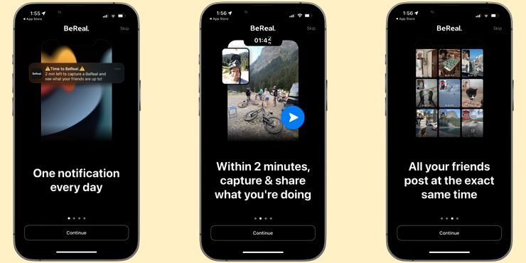 Y eso es exactamente lo que intenta hacer la aplicación BeReal. En esencia, BeReal es una aplicación para compartir fotos no muy diferente a Instagram o Snapchat. Abre BeReal, captura una foto y la comparte para que la vean sus amigos. Pero hay un giro. Los usuarios de BeReal reciben una notificación todos los días para abrir la aplicación y tomar una foto de lo que están haciendo. Las notificaciones se envían a diferentes horas cada día y los usuarios solo tienen dos minutos para tomar una foto. Esa aleatoriedad y sentido de inmediatez están diseñados para alentar fotos reales y legítimas de personas, no el contenido falso y escenificado en todas las demás redes sociales. Como su nombre lo indica, la intención es “ser real” sobre lo que estás posando.