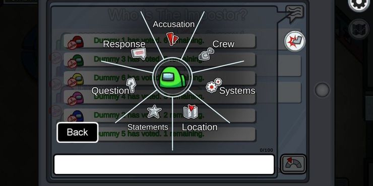 La rueda de Quickchat tiene opciones para cada aspecto de Entre nosotros: Acusación, Tripulación, Sistemas, Ubicación, Declaraciones, Pregunta y Respuesta. Estas opciones de chat predeterminadas significan que los jugadores ya no tienen que escribir respuestas o preguntas cuando juegan. El chat de texto es una forma importante de hablar con otros jugadores en Entre nosotros, especialmente para aquellos que no usan el chat de voz, y estas nuevas opciones de Quickchat son una forma de comunicarse enormemente mejorada.