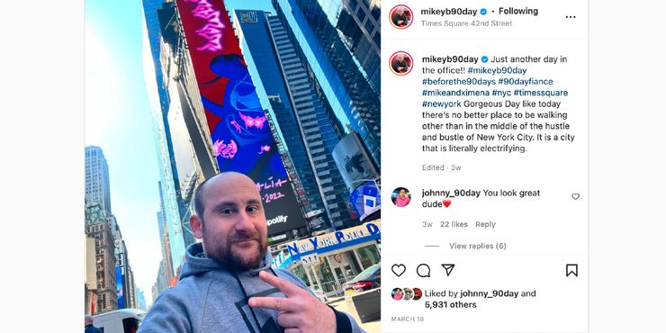 Hasta ahora, Mike ha confirmado su Antes de los 90 días amistades pero mantuvo su romance como un misterio. Eso podría deberse a que los espectadores creen que aparecerá en el futuro contenido de la franquicia. Un fan vio a Mike filmando con una mujer misteriosa hace varias semanas. Sin embargo, nada ha sido confirmado. Mientras tanto, Mike parece estar disfrutando de su vida en Nueva York y aparentemente continúa con su trabajo como técnico de soporte de TI. Parece que Mike se estará preparando para un esperanzado viaje por carretera con varios de sus Antes de los 90 días Miembros del elenco de la temporada 5. Mike también ha insinuado que derramará chismes de franquicias importantes en el futuro. Sin embargo, muchos espectadores creen que su contrato le prohibirá compartir demasiado.