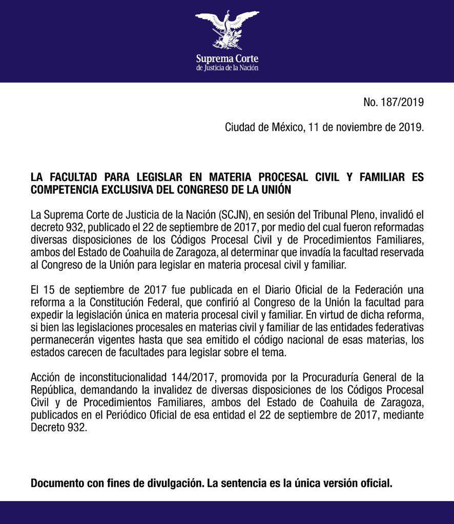 Los opositores a la iniciativa retoman lo publicado recientemente por la Suprema Corte de Justicia de la Nación que, al resolver otros asuntos, estableció que “la facultad para legislar en materia procesal civil y familiar es competencia exclusiva del Congreso de la Unión”:
