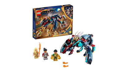 Este set de construcción titulado ¡Emboscada de los Desviantes! está inspirado en la película Eternals de Marvel. Incluye tres mini figuras de superhéroes (Thena, Makkari y Gilgamesh), una figura de Desviante articulada con una boca que se abre y cierra, una daga, un arma en el puño y un lanzador para recrear en casa las escenas de la película. Es un regalo recomendado para niños a partir de seis años.
