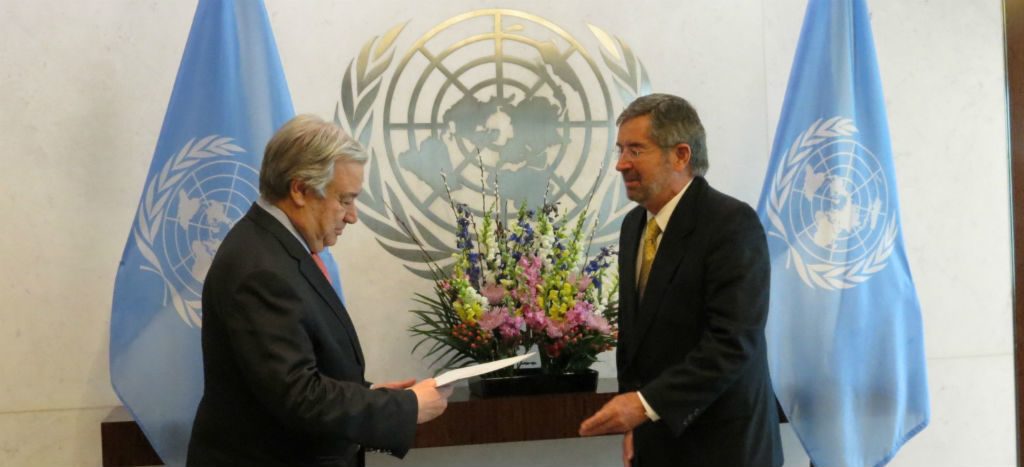 Entrega al secretario general de la ONU, António Guterres, las cartas credenciales que lo acreditan como representante permanente de México ante esa organización.