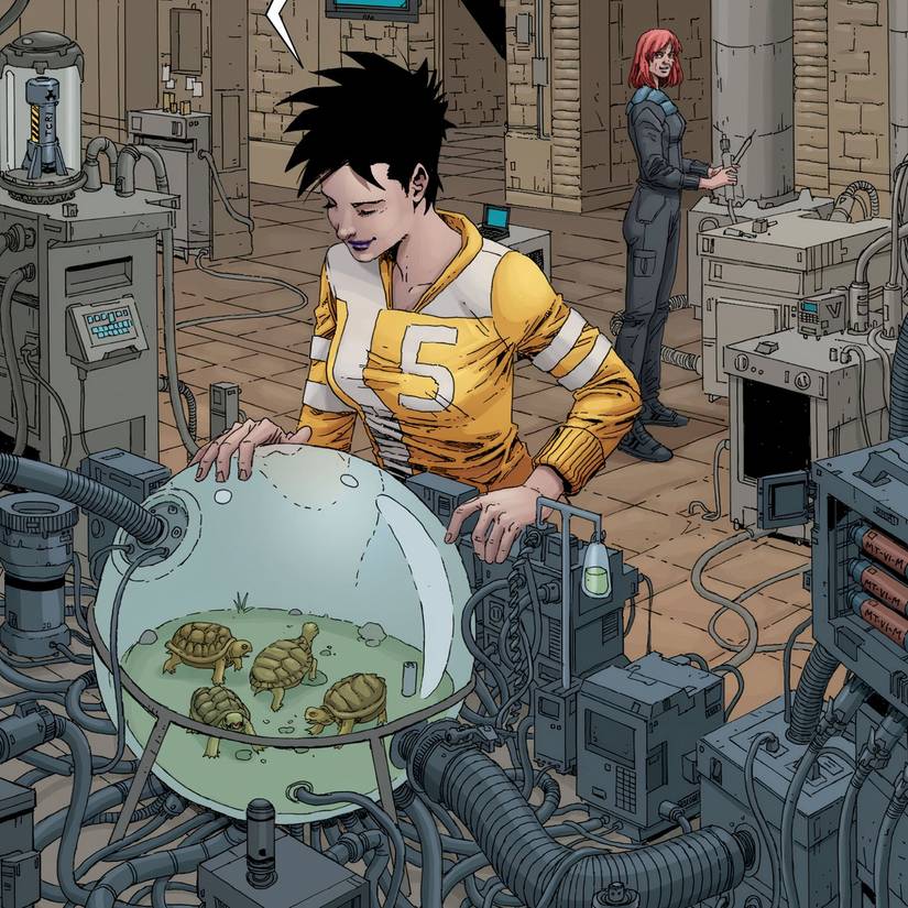 En Tortugas Ninja Adolescentes Mutantes: El Último Ronin II – Re-Evolución #2 de Kevin Eastman, Tom Waltz, Ben Bishop y Esau e Isaac Escorza, April O’Neil está hablando con Fugitoid, cuya conciencia ahora reside dentro de una supercomputadora en una base secreta. April y Fugitoid están probando el ADN de Odyn después de que misteriosamente se convirtiera en piedra durante su última misión.