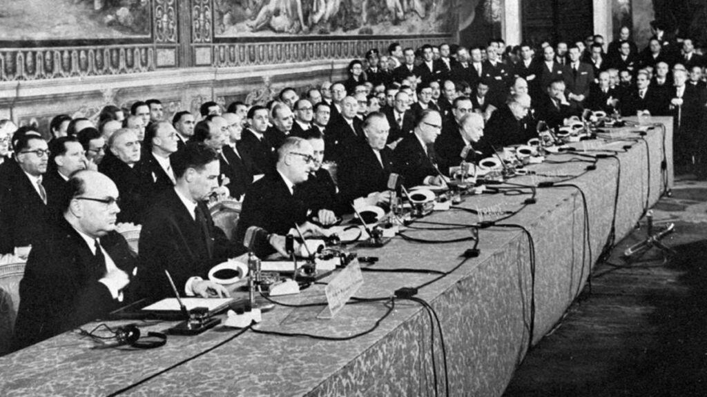 1957: en Italia se firman los Tratados de Roma, momento importante en la historia de la Unión Europea.