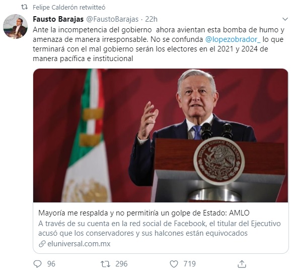 “Vas a salir por la vía democrática, sólo pórtate bien”, anticipa Fox. Calderón da un retuit en el mismo sentido.