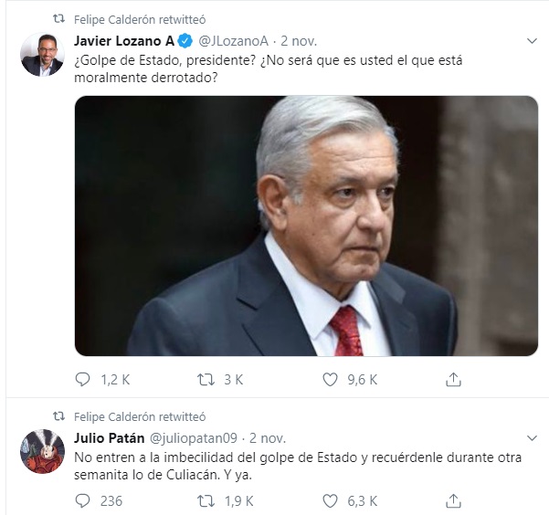 “Vas a salir por la vía democrática, sólo pórtate bien”, anticipa Fox. Calderón da un retuit en el mismo sentido.