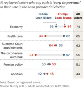 Según los resultados obtenidos por el Pew Research Center (encuesta realizada entre el 6 y el 12 de octubre), un 74% de votantes apuntó a la economía como un aspecto muy importante para su voto en estas elecciones presidenciales. Esto se condice con la delicada situación económica por la que cruza Estados Unidos, en función de las medidas sanitarias adoptadas para enfrentar el Covid-19. A la par, un 65% de los respondientes indicó que “el cuidado de la salud”, y un 55% que el “brote de coronavirus” eran temas muy importantes para su voto.