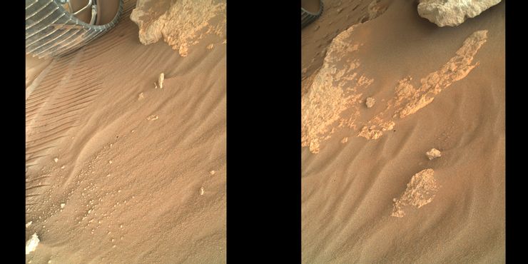 Pero esa no es la única imagen que Perseverance tomó del suelo debajo de él. El rover también compartió las dos imágenes anteriores, las cuales revelan diferentes terrenos que atraviesa el rover. La foto de la izquierda muestra una roca que sobresale junto a la rueda de Perseverance, con un mar de pequeños guijarros detrás. La imagen de la derecha no tiene guijarros, aunque sí revela un par de rocas escondidas bajo un manto de arena interminable de Marte. Tienen un color naranja/amarillo distintivo y parecen bastante desgastados (probablemente como resultado de millones de años de viento y tormentas de arena).