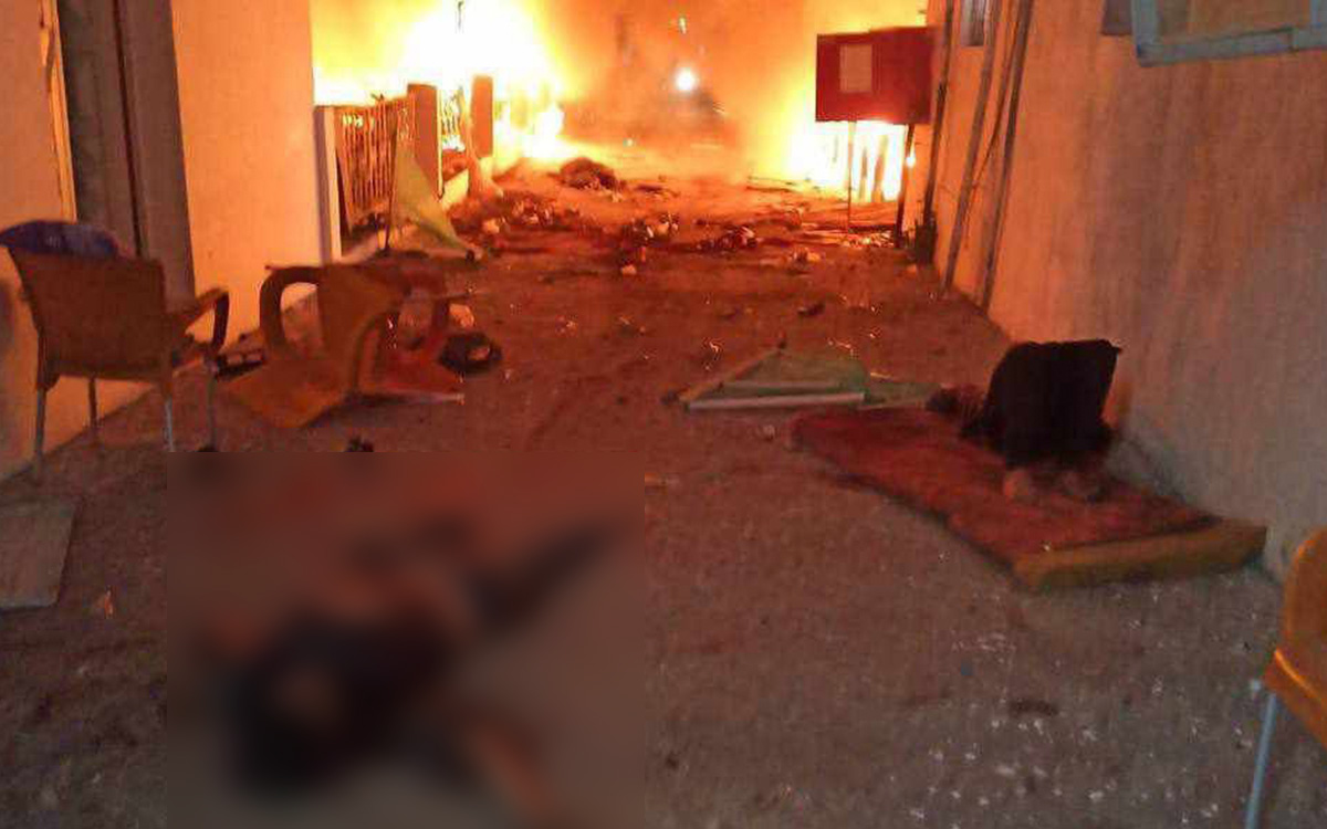 Las imágenes del interior del hospital mostraban unas dos docenas de vehículos destruidos en su recinto. Estaban rodeados de edificios dañados con las ventanas reventadas. Había manchas de sangre en las paredes y en el suelo.