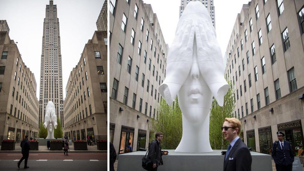 Es la obra “Behind the Walls” (Detrás de los muros), la cabeza monumental de una joven con los ojos tapados con sus manos que parece no querer mirar a la Quinta Avenida, no querer ver Nueva York, que quiere esconderse en su interior detrás de unos muros, que no son otra cosa que sus manos, y que estará expuesta hasta el 28 de junio.