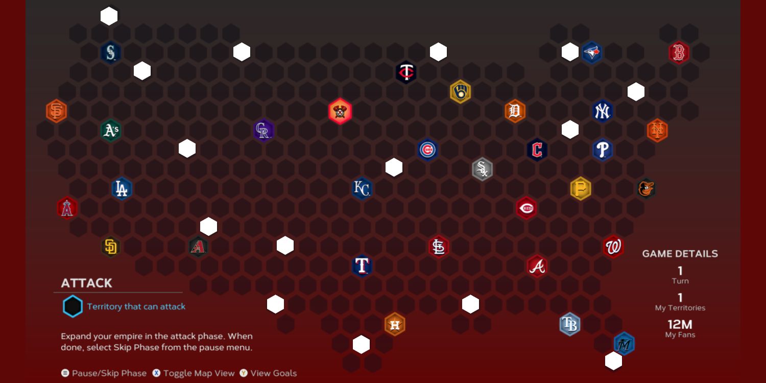 Mientras tanto, los objetivos son un poco más complicados. Cada objetivo requiere que los jugadores completen tareas específicas. mientras conquistan el mapa de la Nación del Béisbol. En su mayor parte, los objetivos giran en torno a conquistar una cierta cantidad de espacios en el tablero, apoderarse de una región particular del mapa en su totalidad o adquirir una cierta cantidad de fanáticos. Los fanáticos se pueden ganar ganando juegos o robándoselos a otros equipos al conquistar sus fortalezas.