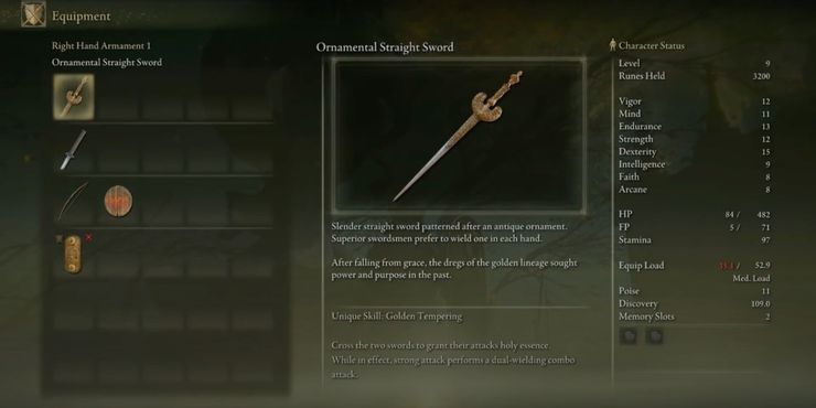Los jugadores que derrotaron a su jefe tutorial de muchos brazos y difícil de vencer en Anillo de Elden recibe la Espada Recta Ornamental, un par de hojas de una mano con protectores en forma de media luna y empuñaduras doradas. Pueden ser utilizados eficazmente por cualquier Anillo de Elden personaje inicial con una Fuerza de 10 y Destreza de 14 y tiene una Habilidad de arma especial llamada “Templado dorado”, que cubre las hojas gemelas en una magia dorada y desbloquea un nuevo conjunto de movimientos de arma de golpes rápidos como el rayo.