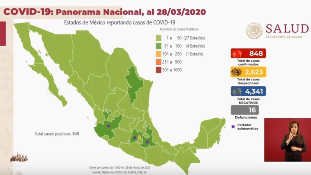 Al cierre de este sábado, la Secretaría de Salud reportó 16 muertes por COVID-19, cuatro más que el viernes, y un registró de 848 casos positivos, 131 más que el reporte previo.