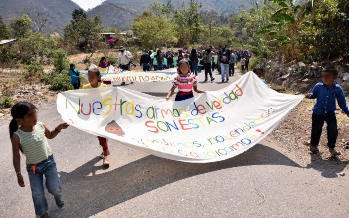Los menores marcharon por las calles de Alcozacán, un pequeño caserío en el municipio Chilapa de Álvarez, enarbolando pancartas que decían “Alto a la violencia” y “Queremos paz”, mientras coreaban consignas, el viernes por la tarde.