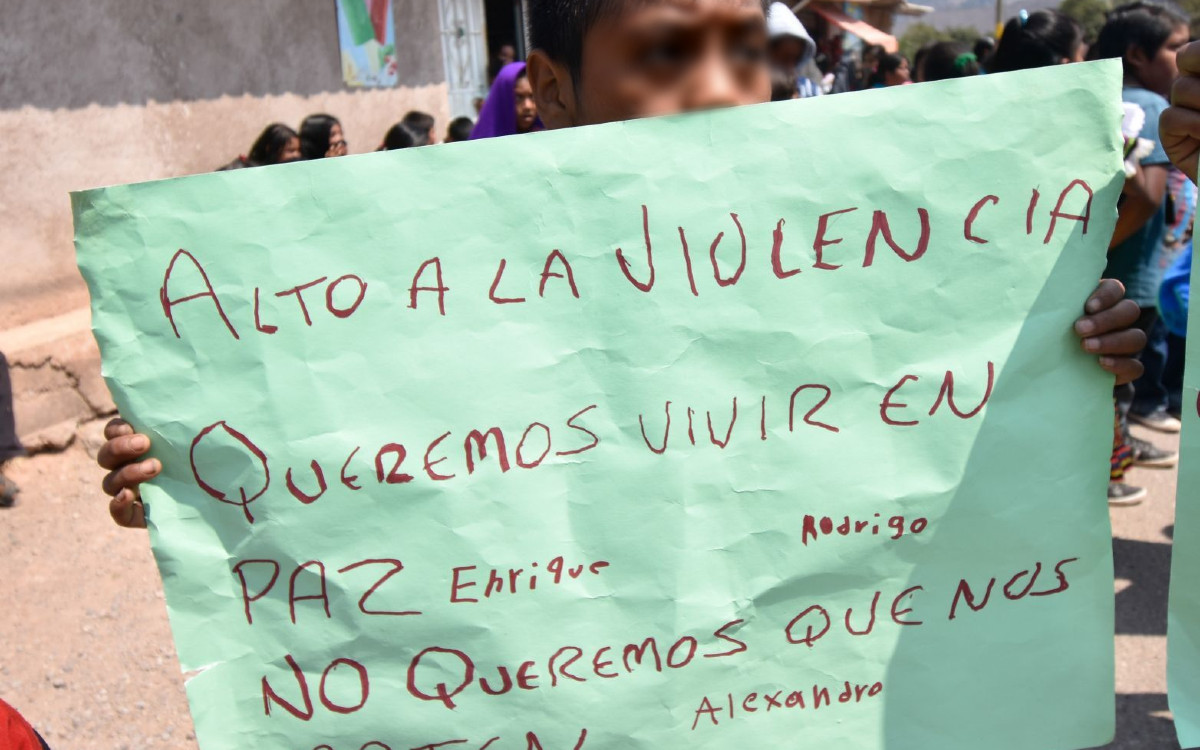 Los menores marcharon por las calles de Alcozacán, un pequeño caserío en el municipio Chilapa de Álvarez, enarbolando pancartas que decían “Alto a la violencia” y “Queremos paz”, mientras coreaban consignas, el viernes por la tarde.
