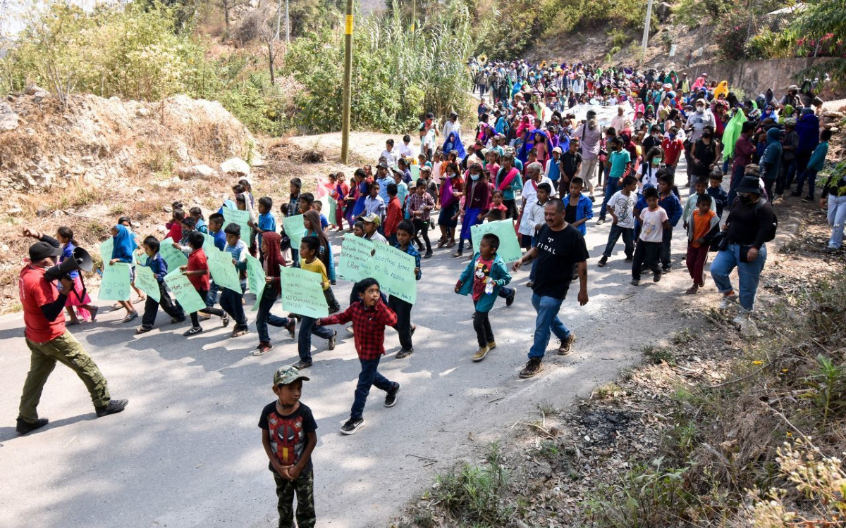 Los menores marcharon por las calles de Alcozacán, un pequeño caserío en el municipio Chilapa de Álvarez, enarbolando pancartas que decían “Alto a la violencia” y “Queremos paz”, mientras coreaban consignas, el viernes por la tarde.