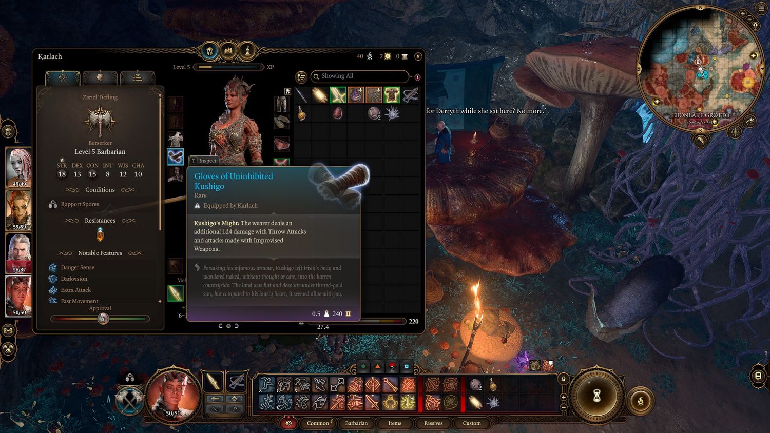 Si el grupo logra rescatar a Baelen, lo podrán encontrar en la Colonia Myconid con su esposa, Derryth. Darle el Noblestalk a cualquiera de los enanos obtendrá el mismo objeto como recompensa: los guantes del desinhibido Kushigo., que añaden 1d4 al daño infligido por los ataques de Lanzamiento o Arma Improvisada del usuario. Al dárselo, Baelen lo cura de su condición mental, lo que desafortunadamente revela que es un marido un tanto abusivo para Derryth, y al dárselo a Derryth, ella simplemente lo toma para venderlo. De cualquier manera, los jugadores están invitados a su tienda, Bonecloak’s Apothecary, en Baldur’s Gate.