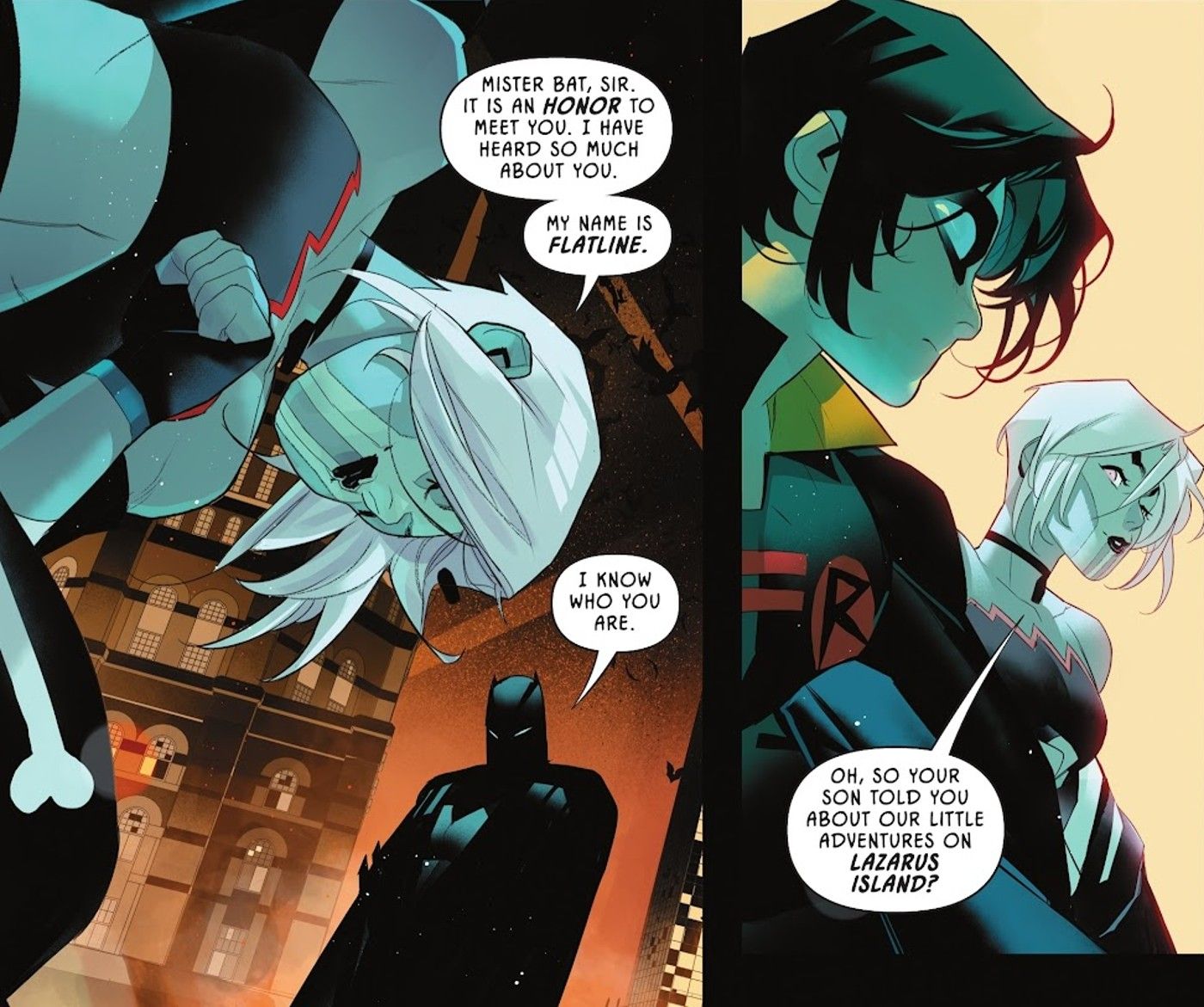 Durante Planeta Lázaro, Flatline no solo fue perseguida por el fantasma del entonces fallecido Ra’s Al Ghul, sino que también resucitó al supervillano, y al abuelo de Damian. Ahora, Nika oculta activamente esta información a Damian a pesar de saber a quién resucitó. Además, al analizar su historia, Queda claro por qué Robin tiene sentimientos encontrados acerca de que Flatline quiera su ayuda.