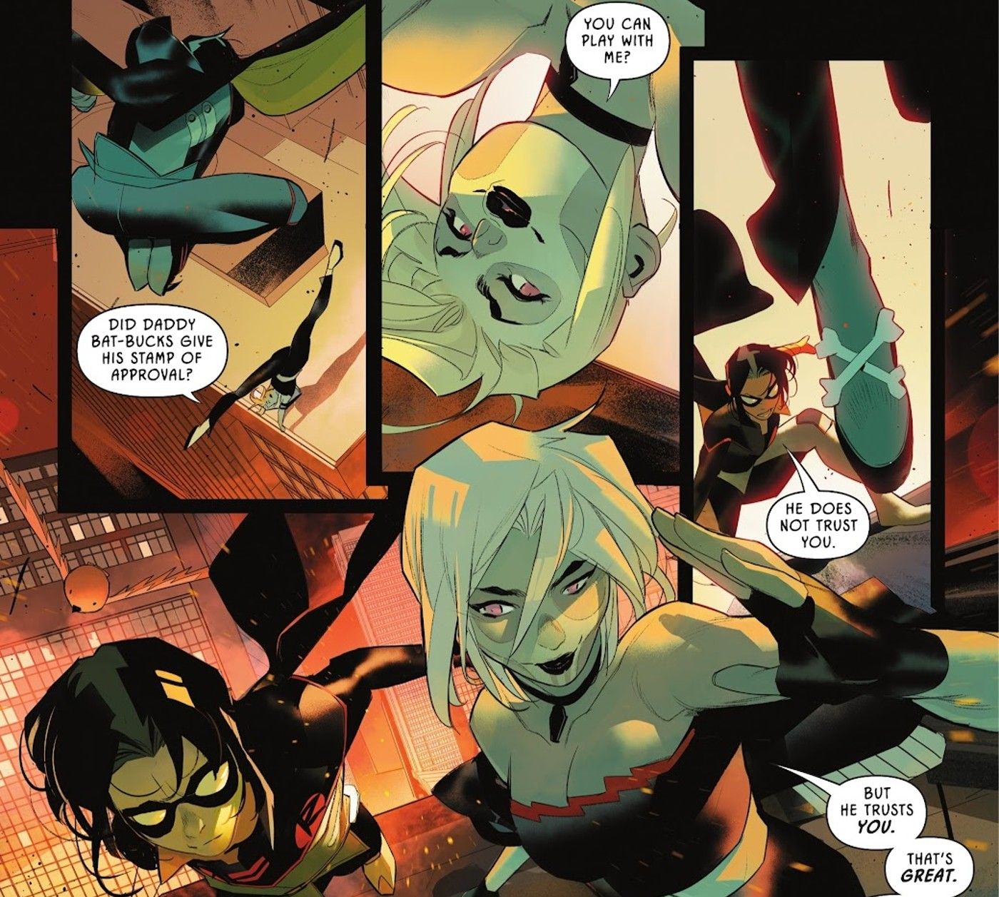 Batman es conocido por tener intereses románticos malvados, incluida la madre de Damian, Talia Al Ghul, y ahora su hijo está siguiendo sus pasos. Damián, sin embargo, está más preocupado por esto que su padre. No es ningún secreto que Robin ha luchado por encontrar el equilibrio entre el bien y el mal. La lucha de Damian empeora cuando se enamora de Flatline, el compañero de Lord Death Man. A partir de batman y robin #7, Bruce conoce al mentor de Nika y sus afiliaciones criminales. Si bien insta a su hijo a ser cauteloso, confía en el juicio de Damian. Por el contrario, Robin lucha por confiar en su propio juicio.