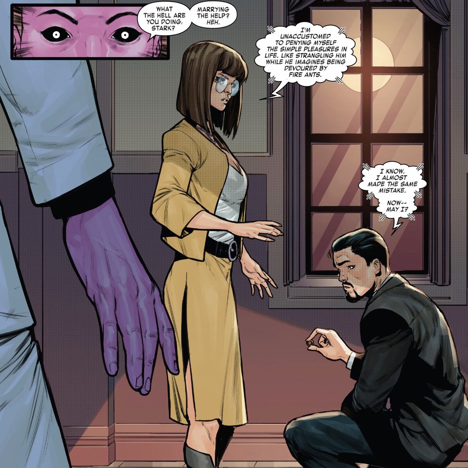 La explicación simple es que Hazel Kendal es una identidad encubierta para Emma Frost, pero hay más que eso. Dejando a un lado el humo y los espejos, la verdadera pregunta para los lectores es: ¿qué revela Hazel como alter ego sobre Emma? El gran día de Tony y Emma tiene lugar en Hombre de Hierro Invencible #10 de Gerry Duggan, Juan Frigeri, Bryan Valenza, Joe Caramagna y Darren Shan de VC. Emma (disfrazada de Hazel) y Tony pelean sobre cómo manejar mejor a Feilong, el genio industrial que se hizo cargo de Stark International para Orchis. El propio Feilong se topa con la discusión y encuentra a Tony aparentemente arrodillado ante Hazel, con el anillo en la mano.