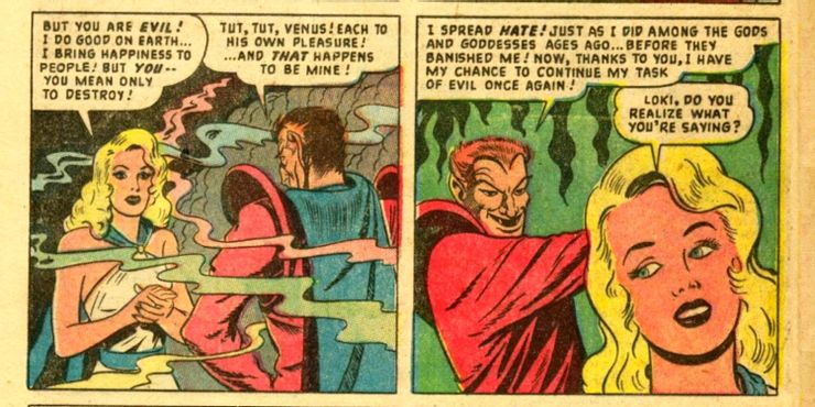 En los primeros cómics de Marvel, Loki tenía una historia de origen ligeramente diferente a la que se compartió en el MCU. En su primera aparición cómica, Venus No. 6 en 1949, Loki era un miembro de los dioses olímpicos que había sido desterrado al inframundo. Classic Loki planeó viajar a la Tierra para esparcir el odio, engañando a Júpiter para que le permitiera poner un pie en la Tierra cuando previamente se le había prohibido salir del Inframundo. El Inframundo es el dominio de Loki, donde reina como Rey – Rey del Inframundo, Dios del Mal y Señor del Odio – rodeado por un ejército de secuaces demoníacos. El Loki clásico tenía la capacidad de entrar en los cuerpos de los humanos, cubrir la ciudad con nubes oscuras de odio y proyección astral. Loki fue reintroducido en su forma moderna 1962 en Viaje al misterio n. ° 85 como la mayor némesis de Thor, y se le puede ver vistiendo el traje que lleva Grant Loki episodio 4. En los cómics de Marvel, el Loki reintroducido tiene una historia de origen similar a su origen en el MCU; nació de la reina Farbauti y el rey Laufey, los líderes de los gigantes de Jotunheim. Si bien ya no tiene enanos demoníacos a su entera disposición, tiene sus poderes tradicionales de proyección astral, hipnosis y más.