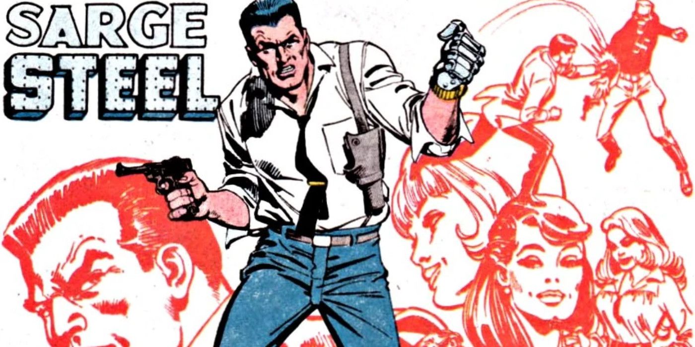 Sargent Steel tiene una larga y colorida historia editorial. Fue creado por Pat Musilli para Charlton Comics y apareció por primera vez en 1964. Sargento de acero #1. Charlton, al ver la explosión de popularidad de los superhéroes gracias a Marvel, decidió crear su propia línea, llamada “Action Heroes”. Si bien Sarge Steel técnicamente no era parte de la línea, conoció a Judomaster, Peter Cannon Thunderbolt y otros personajes de Charllton. En sus primeras aventuras, Sarge Steel era un veterano de Vietnam y un detective privado que finalmente se convirtió en espía. Sarge Steel se distingue por su mano izquierda metálica, que también alberga una pistola.