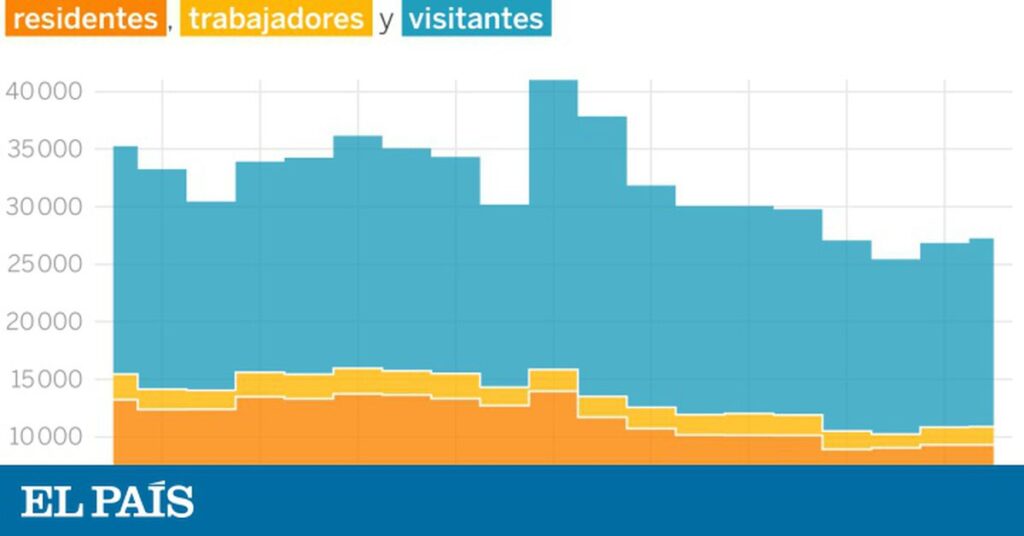 El día a día de la evacuación. En el primer gráfico muestro el total de personas que se mueven por los alrededores del volcán (en el área gris del mapa anterior). La semana antes de la erupción eran unas 32.000 cada día y ahora son unas 27.000. Pero mirad qué pasa cuando dividimos a esas personas entre residentes y visitantes: