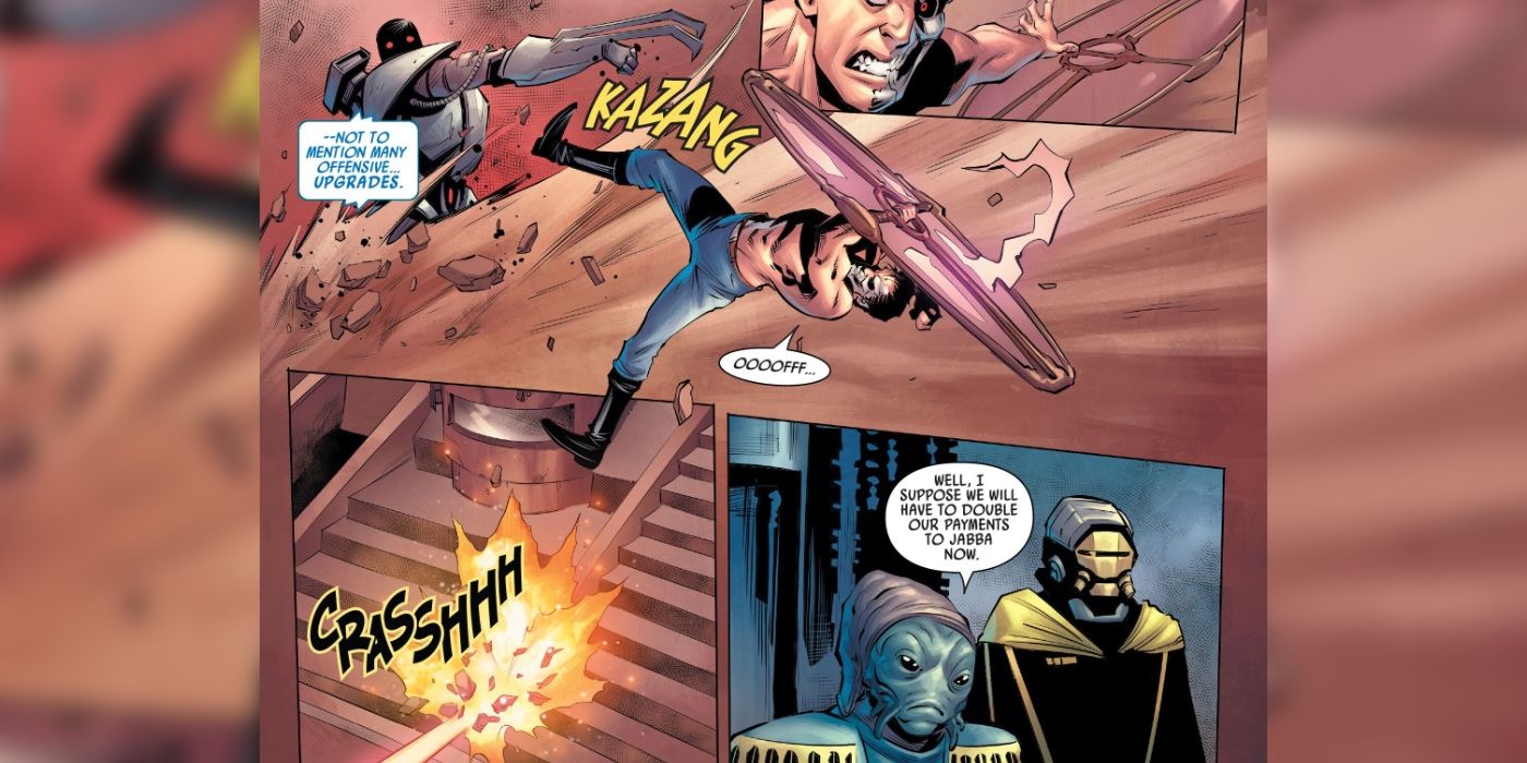 Queriendo enviar un mensaje a sus rivales y otros sindicatos del crimen, Jabba obligó a Beliert Valance a luchar públicamente contra aquello por lo que había venido: el nuevo Megadroid del gángster hutt.