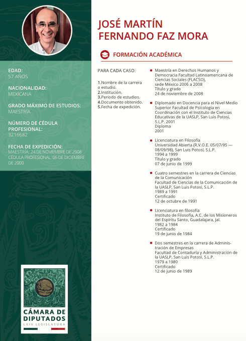 -Tiene dos licenciaturas en Filosofía y maestría en Derechos Humanos y Democracia por la Facultad Latinoamericana de Ciencias Sociales (FLACSO).